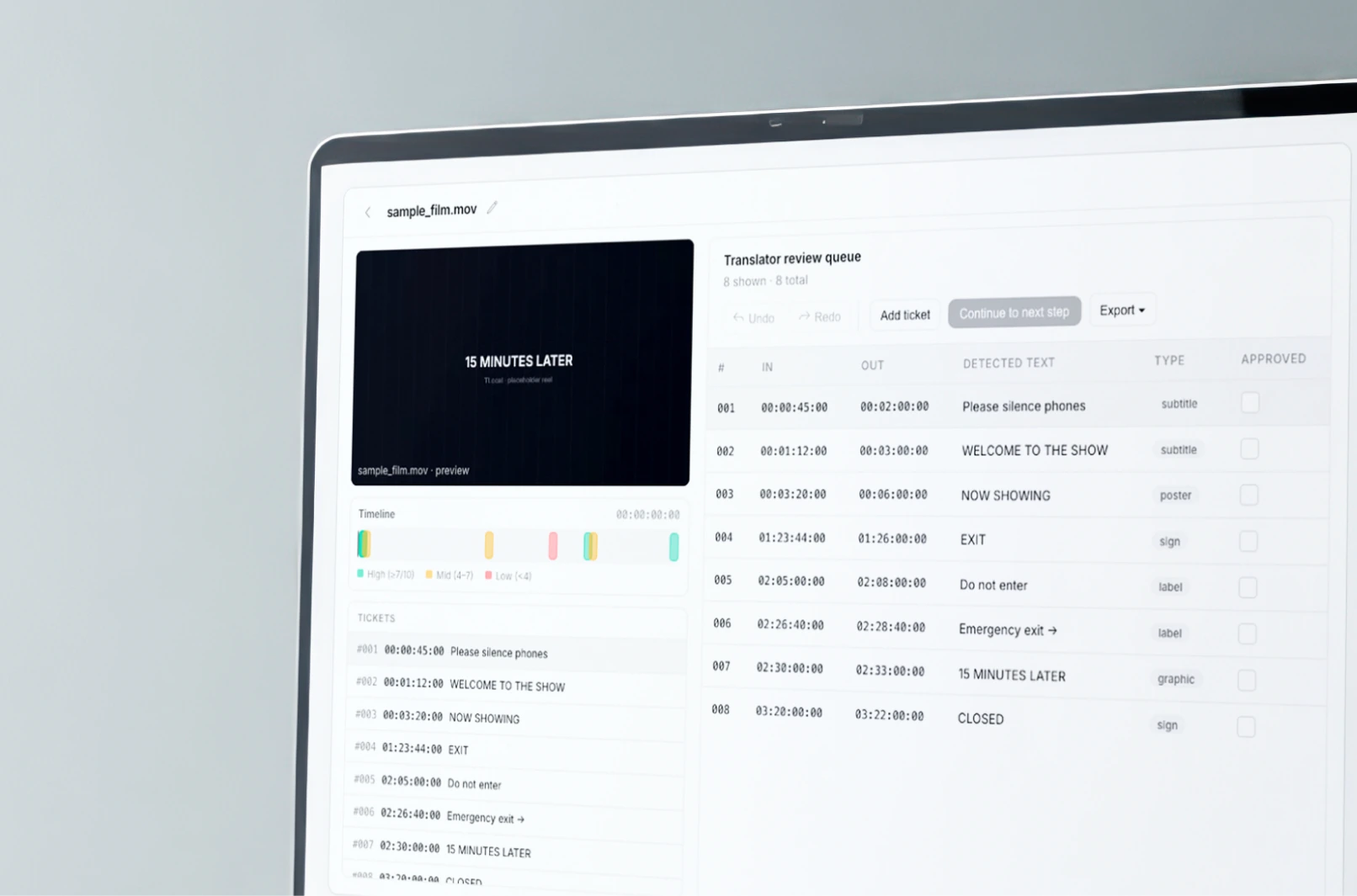 Turn signs, subtitles, credits, and graphics into reviewable tickets—each tied to timecode and scoped to full films and long programmes, not isolated clips.