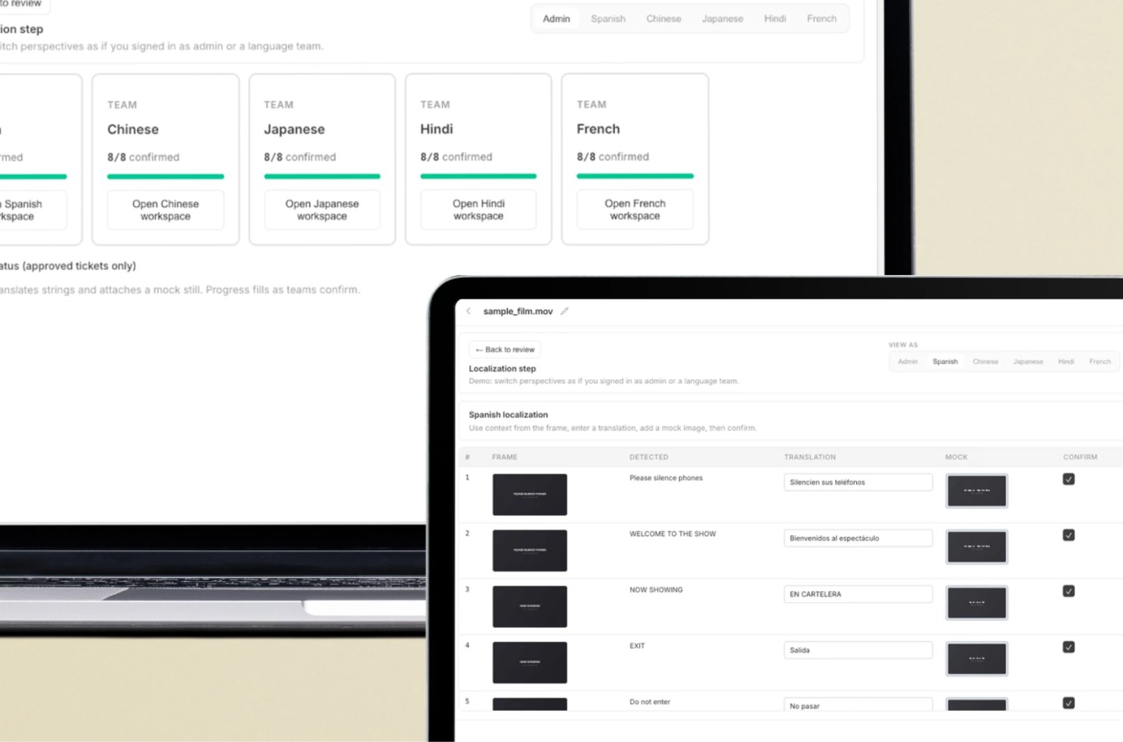 Every team reviews suggestions, refines translations, and collaborates in full frame-and-timecode context.